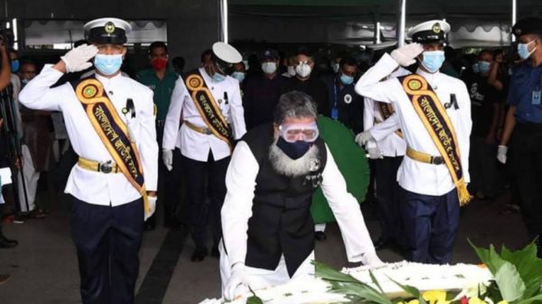 এ সময় প্রধানমন্ত্রী কিছুক্ষণ নীরবে দাঁড়িয়ে থাকেন। বিউগলে বাজানো হয় করুণ সুর। সশস্ত্র বাহিনীর একটি চৌকস দল গার্ড অব অনার দেয়।