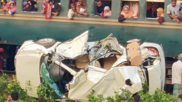 যশোরের অভয়নগরের নওয়াপাড়ায় ট্রেনের সঙ্গে প্রাইভেট কারের সংঘর্ষে চারজন নিহত হয়েছেন। আহত হয়েছেন দু’জন। শুক্রবার বিকেল সাড়ে ৪ টার দিকে উপজেলার নওয়াপাড়া ভৈরব ব্রিজ রেলক্রসিংয়ে এ ঘটনা ঘটে। হতাহতরা সবাই প্রাইভেট কারের যাত্রী। নিহতদের মধ্যে দু’জন পুরুষ, একজন নারী ও একজন শিশু কন্যা রয়েছে। প্রত্যক্ষদর্শীরা জানান, ভৈরব ব্রিজ থেকে একটি প্রাইভেটকার যশোর-খুলনা মহাসড়কের দিকে যাওয়ার সময় খুলনাগামী ট্রেন মহানন্দা এক্সপ্রেসের সঙ্গে সংঘর্ষ হয়। ট্রেনের ধাক্কায় প্রাইভেটকারটি দুমড়ে-মুচড়ে যায়। ঘটনাস্থলে নিহত হয় দু’জন। আহত অপর তিনজনকে উদ্ধার করে স্থানীয় উপজেলা স্বাস্থ্য কমপ্লেক্সে ভর্তির পর এক শিশু ও অপর একজনকে খুলনা মেডিকেল কলেজ হাসপাতালে নেয়ার পর তারও মৃত্যু হয়।অভয়নগর থানার ওসি তাজুল ইসলাম জানান, নিহতরা হলেন নড়াইলের বাসিন্দা ইঞ্জিনিয়ার হিরক, তার বন্ধু আশরাফুল, তাদের একজনের স্ত্রী এবং সাত বছরের এক শিশু।
