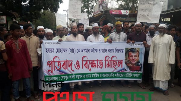 ফেনী ছাগলনাইয়া উপজেলার ইউনিয়নের বক্তারহাটের দেবপুর আলী মজুমদার জামে মসজিদ ও বক্তার হাট ক্রীড়া সোসাইটির এবং বক্তারহাটের সর্বস্তরের তৌহিদি জনতা উদ্যোগে গত শনিবার (৩১অক্টোবর) বিকাল ৪ ঘটিকায় সময় ফ্রান্সে মহানবী (সঃ) এর ব্যঙ্গ চিত্র প্রদর্শনের প্রতিবাদে বিক্ষোভ মিছিল অনুষ্ঠিত হয় উক্ত বিক্ষোভ মিছিলটি ৫নং মহামায়া ইউনিয়নের বক্তারহাট বাজার থেকে বিক্ষোভ মিছিল শুরু হয়ে চাঁদগাজী বাজার প্রদক্ষিণ করে আবার বক্তারহাট আসে শেষ হয়। উক্ত বিক্ষোভ মিছিলে অংশ নেয় দেবপুর ইসলামিয়া ফাজিল ডিগ্রী মাদ্রাসার আরবি প্রভাষক আব্দুল হালিম, নুর হাজী জামে মসজিদের সভাপতি মাওলানা হারুনুর রশিদ,দেবপুর আলী মজুমদার জামে মসজিদ’র আহমেদ মজুমদার, বক্তার হাট ক্রীড়া সোসাইটির সভাপতি মোঃ শরিফুল ইসলাম, সাধারণ সম্পাদক আজাদ হোসেন শামীম সহ অনেকে। ফ্রান্সের সকল প্রোডাক্ট বয়কট ও কূটনীতিক সম্পর্ক ছিন্ন করার পাশাপাশি ফ্রান্সকে ক্ষমা চাওয়ার আহবান জানান, নবী প্রেমিক তাওহীদি জনতা নামক সংগঠনের নেতৃবৃন্দ।