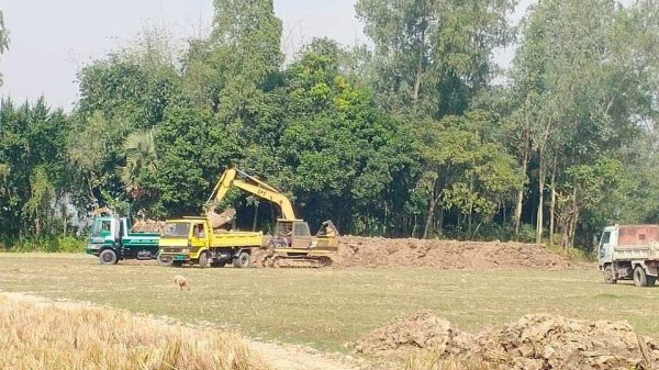 বগুড়ার শেরপুর উপজেলার পানিসাড়া হিন্দুপাড়ায় আইন কানুনের তোয়াক্কা না করে আবাদি কৃষি জমি খনন করে বানানো হচ্ছে পুকুর, ফলে হ্রাস পাচ্ছে কৃষি জমি। এই পুকুর খননের ফলে ক্ষতির সম্মূখীন হচ্ছেন কৃষকেরা, দৃষ্টি দিচ্ছে না স্থানীয় প্রশাসন। সরেজমিনে দেখা যায় শেরপুর উপজেলার বিশালপুর ইউনিয়ন এর পানিসাড়া গ্রামের হিন্দুপাড়ায় প্রভাবশালী” আব্দুল খালেক” এর ১০/১১বিঘা আবাদি কৃষি জমিতে চলছে বেকু দিয়ে মাটি খনন করে পুকুর তৈরীর কাজ। যে পুকুরটি খননের ফলে স্থানীয় কৃষকরা ক্ষতিগ্রস্তের আশঙ্কায় পরেছেন মহা বিপাকে। আব্দুল খালেকের আবাদি কৃষি জমি খনন করে পুকুর তৈরী প্রসঙ্গে একই গ্রামের কৃষক ইদ্রিস আলী বলেন, এই খননাধীন জমির পাশেই আমার ২০ শতাংশ ধানী জমি রয়েছে, সেই জমির পাশে পুকুর হলে আমার ধানী জমির উৎপাদন কমে যাবে। কারণ জমিতে সৃষ্টি হবে জলাবদ্ধতা ফলে ক্ষতিগ্রস্ত হওয়ার সম্ভাবনা বেশী কিন্তু পুকুর খননকারী প্রভাবশালী হওয়ার কারণে আমরা কিছু বলা তো দুরের কথা বিষয়টি তাকে বোঝাতেও পারছি না । পানিসাড়ার হিন্দুপাড়ার সহাদেব চন্দ্র সরকার বলেন খননাধীন এই পুকুরের পাশে আমাদের ৬ ভাইয়ের পৈত্রিক সুত্রে পাওয়া ৫ বিঘা ধানী জমি রয়েছে, এখানে পুকুর খনন হলে আমাদের উত্তর ও দক্ষিণের জমির পানি পশ্চিমে গড়ে, কিন্তু খননাধীন জমি পশ্চিমে হওয়ার কারণে পানি গড়ার ব্যবস্থা বন্ধ হয়ে যাবে, ফলে জলাবদ্ধতা সৃষ্টি হয়ে এখন যে পরিমাণ ফসল হয় সেই ফসলের উৎপাদন অর্ধেক হয়ে যাবে যাতে করে আমরা ফসল উৎপাদনে লোকসানের সম্মূখীন হব এবং অর্থনৈতিক ভাবে ক্ষতিগ্রস্ত হব। এছাড়াও খননাধীন জমির মাঝ খান দিয়ে অন্যান্য জমিতে যাতায়াতের প্রধান আইল (জমির চারপাশের রাস্তা )। এই জন্য খননাধীন জমির চারিদিকে থাকা অন্যান্য মালিকের প্রায় ২০ বিঘা আবাদি কৃষি জমিতে যাতায়াতের সমস্যা হবে। পুকুর খনন প্রসঙ্গে খননাধীন জমির মালিক আব্দুল খালেককে পুকুর খননের কোনো অনুমতি আছে কিনা জানতে চাইলে তিনি বলেন আমিতো কোনো অনুমতি নেইনি, কোনো অনুমতি নেওয়ার প্রয়োজন আছে কি? এ বিষয়ে মুঠোফোনে শেরপুর উপজেলা কৃষি কর্মকর্তা শারমিন আক্তারের সাথে যোগাযোগ করলে তিনি বলেন, এ বিষয়ে ব্যবস্থা নিবেন উপজেলা ভূমি অফিস,এ ব্যপারে কৃষি অধিদপ্তরের কোনো কিছু করনীয় নাই। এ ব্যাপারে মুঠোফোনে শেরপুর উপজেলা নির্বাহী কর্মকর্তা লিয়াকত আলী শেখ বলেন, আমরা পুকুর খননের কোনো অনুমতি দেয়নি বলে তিনি মোবাইল কেটে দেন,পরর্বতীতে ফোন দিলে তিনি রিসিভ করে না।