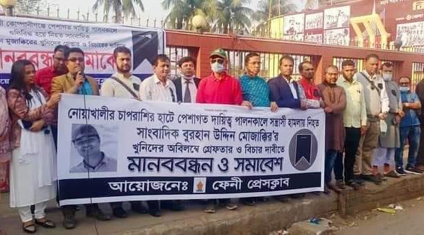 নোয়াখালীর কোম্পানিগঞ্জের কাদের মির্জা-বাদল গ্রুপের সংঘর্ষ চলাকালে সাংবাদিক বোরহান উদ্দিন মুজাক্কেরকে গুলি করে হত্যার প্রতিবাদে ফেনীতে প্রতিবাদ সভা ও মানববন্ধন করা হয়েছে।