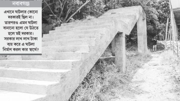 আমেনা বেগম নামে এক গৃহবধূ বলেন, ‘কাপড়চোপড় ধোয়াসহ দৈনন্দিন অনেক কাজ নদীতে করতে হয়। ঘাটলাটি তৈরি করা হলেও আমরা ব্যবহার করতে পারছি না। শিগগিরই ঘাটলায় যাওয়ার রাস্তা তৈরি করা দরকার।’