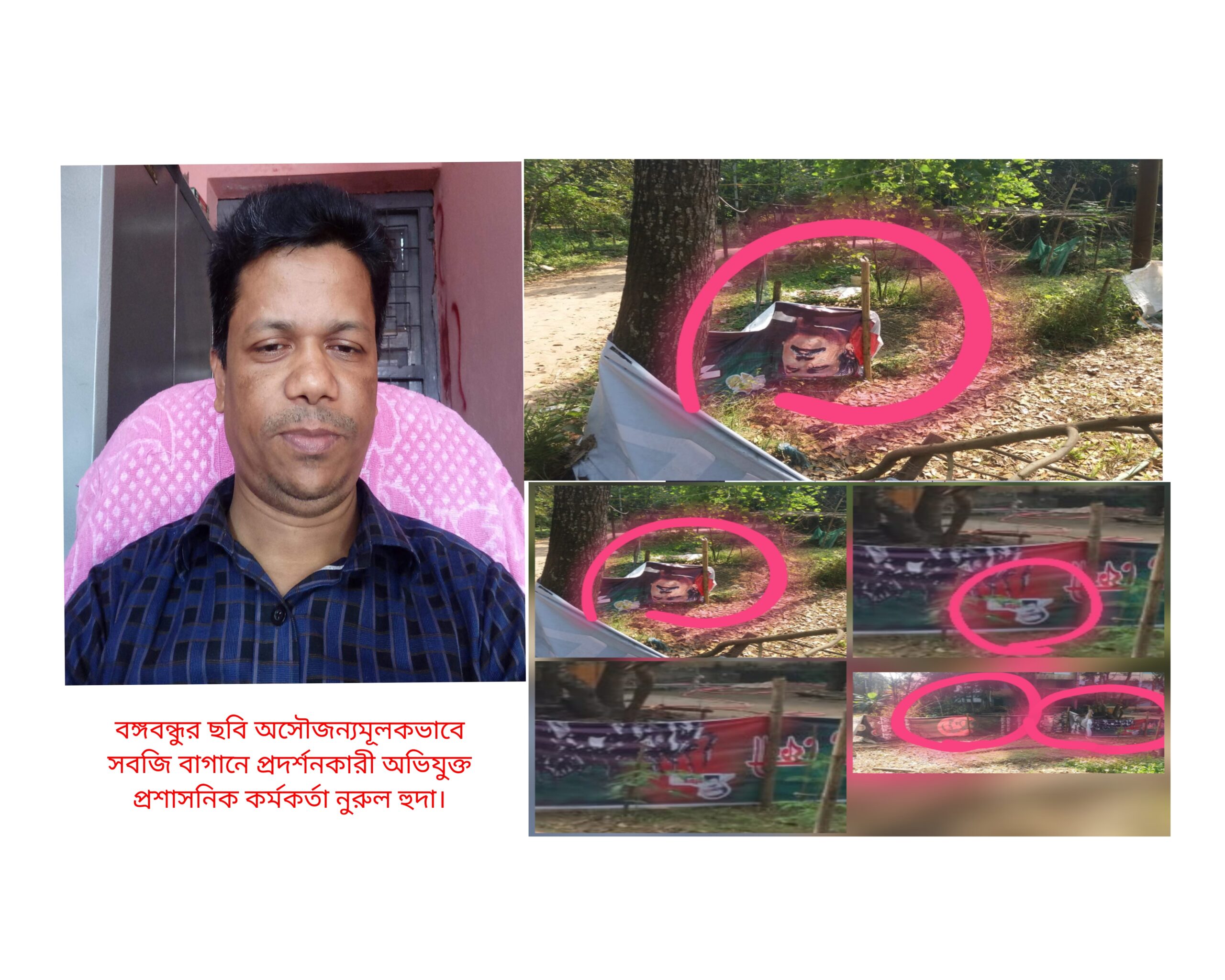 ফেনীর ছাগলনাইয়া ইউএনও অফিসের প্রশাসনিক কর্মকর্তা নুরুল হুদার বিরুদ্ধে জাতির জনক বঙ্গবন্ধু শেখ মুজিবুর রহমান এর ছবি সম্বলিত ব্যানার সবজি বাগানে অসৌজন্যমূলকভাবে প্রদর্শনের অভিযোগ উঠেছে।বিষয়টি সামাজিক যোগাযোগ মাধ্যমে প্রকাশ হলে সচেতন মহলে ক্ষোভের ঝড় উঠে । জাতির সূর্যসন্তান মুক্তিযোদ্ধা এবং রাজনৈতিক ব্যক্তিরা অভিযুক্তের যথাযথ শাস্তির ও দাবি জানান। তারা বলেন বঙ্গবন্ধুকে অসম্মান করা মানে পুরো জাতিকে অসম্মান করা। বঙ্গবন্ধুকে কটুক্তি করা আমরা কোন অবস্থাতে মেনে নিতে পারছিনা। তাকে চাকুরীচ্যুত করা দরকার। একটি স্বাধীন সার্বভৌম মানচিত্রের সাথে যিনি জড়িয়ে রয়েছেন এবং এই ভূখন্ডের প্রতিটি ধুলিকণার সাথে রয়েছে যার সম্পর্ক তিনি হলেন বঙ্গবন্ধু শেখ মুজিবুর রহমান।এই বিশেষ ব্যক্তির ছবি যখন অসম্মানজনকভাবে সবজি বাগানের নিরাপত্তা বেস্টনী হিসেবে ব্যবহার করা হয় ঠিক তখনি বিষয়টি সচেতন মহলে নাড়া দেয়। এছাড়াও প্রশাসনিক কর্মকর্তা নুরুল হুদার বিরুদ্ধে হট ভাটা,বেকারী, হোটেলসহ বিভিন্ন ব্যক্তি ও স্থান থেকে চাঁদা আদায়ের অভিযোগ উঠেছে।মহামায়া ইউনিয়ন আওয়ামীলীগ নেতা লিটন ও রাধানগর ইউনিয়নের মহিলা আওয়ামীলীগ নেত্রী সালমা আক্তার জানায় তারা বয়স্ক ভাতা, বিধবা ভাতাসহ বিভিন্ন কাজে অফিসে আসলে ঘুষ ছাড়া সে কাজ করেনা এবং তাদের কাছে টাকা দাবি করে।