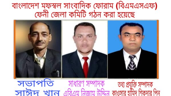 বাংলাদেশ মফস্বল সাংবাদিক ফোরাম (বিএমএসএফ) ফেনী জেলা কমিটি গঠন করা হয়েছে। এতে দৈনিক আমার বার্তার স্টাফ রিপোর্টার ও সাপ্তাহিক উদয় পত্রিকার ভারপ্রাপ্ত সম্পাদক এম এ সাঈদ খানকে সভাপতি এবং দৈনিক ইনকিলাব ও ডেইলি ট্রাইবুনাল প্রতিনিধি এবিএম নিজাম উদ্দিনকে সাধারণ সম্পাদক ঘোষণা করা হয়েছে। শনিবার দুপুরে সংগঠনটির কেন্দ্রীয় কার্যালয়ে অনুষ্ঠিত এক সভায় ৩৩ সদস্য বিশিষ্ট ফেনী জেলা কমিটির অনুমোদন দেন বিএমএসএফ এর কেন্দ্রীয় সভাপতি শহীদুল ইসলাম পাইলট ও সাধারণ সম্পাদক জসিম মাহমুদ ।