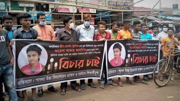 নারায়ণগঞ্জ সদর উপজেলার কুতুবপুরের পাগলা গ্রীন ডেলটা হাসপাতালে ভুল চিকিৎসায় আয়শা আক্তার আলপি (১৪) নামের এক কিশোরীর হত্যার বিচারের দাবিতে মানববন্ধন করেছে পাগলা উচ্চ বিদ্যালয়ের শিক্ষক, শিক্ষার্থী ও আলপির পরিবারের